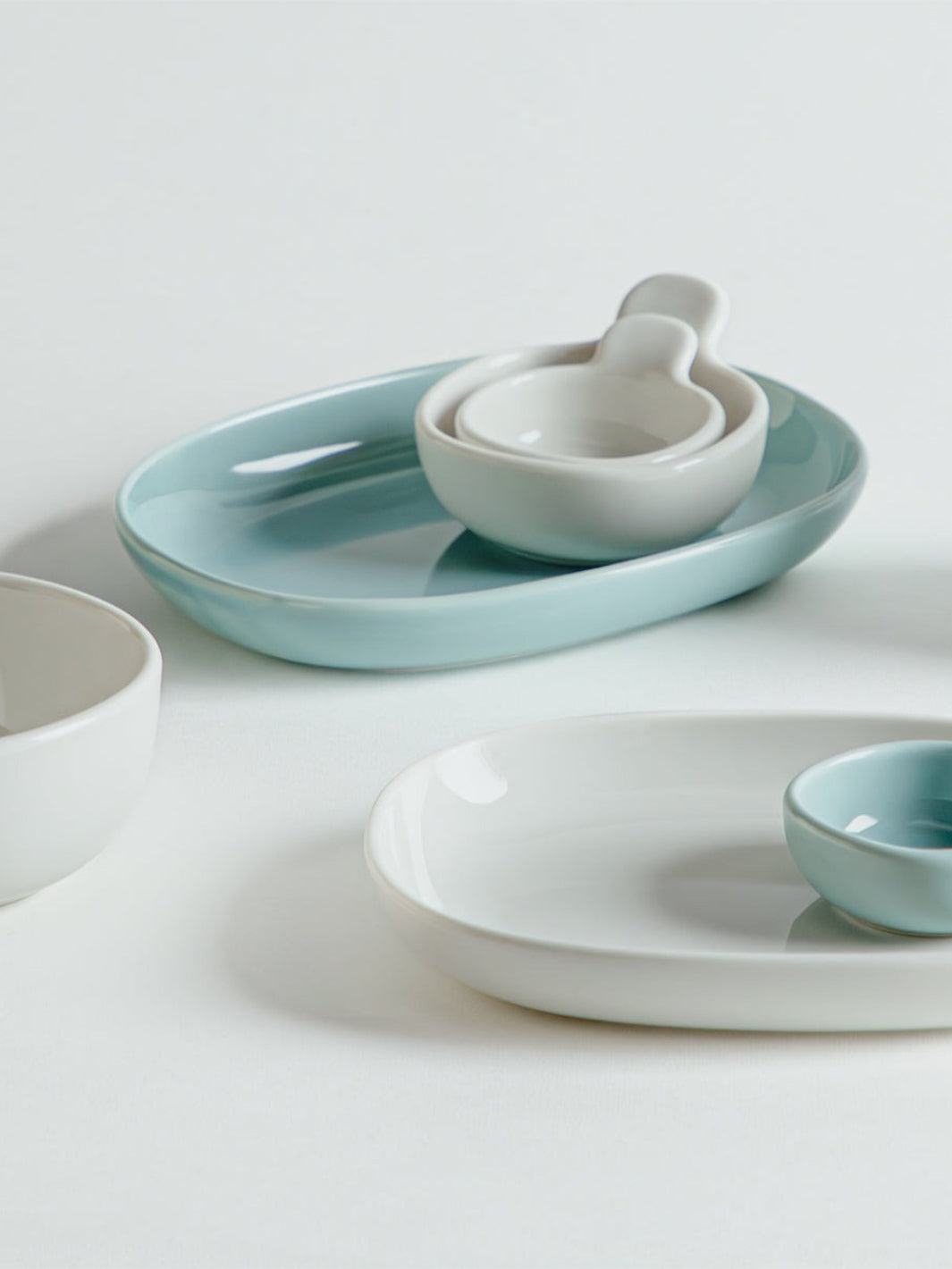 The wide range of shapes can be combined in various ways to accommodate diverse dishes. NEST is designed for easy handling by kids and comfortable feeding by parents, and the rounded shape makes it easy to scoop. Bowls and plates can be stacked for compact storage.