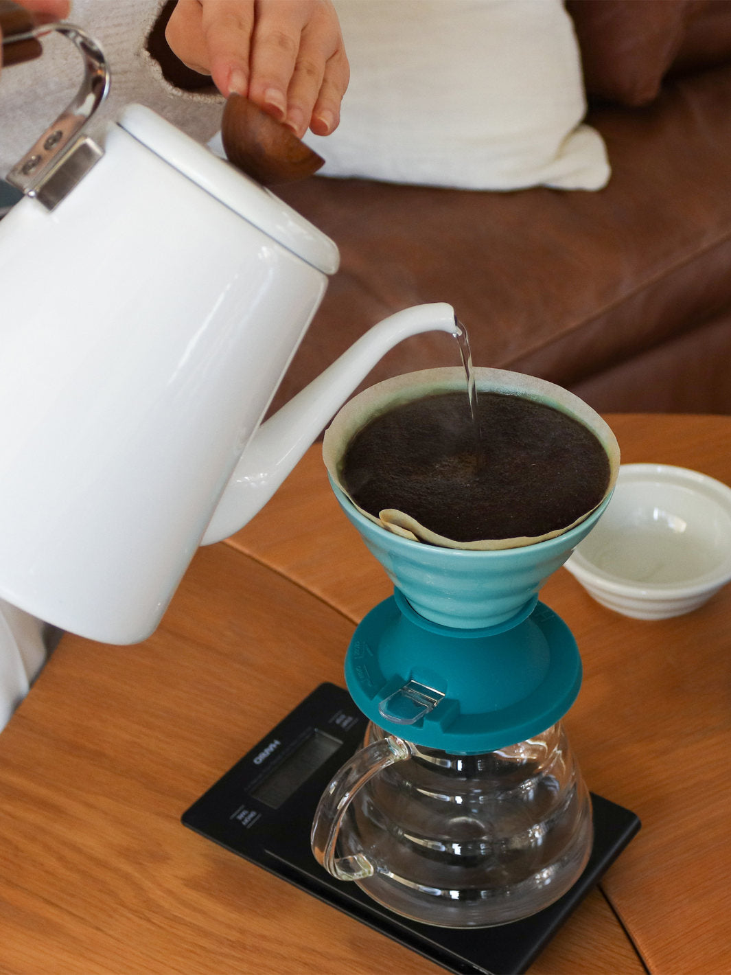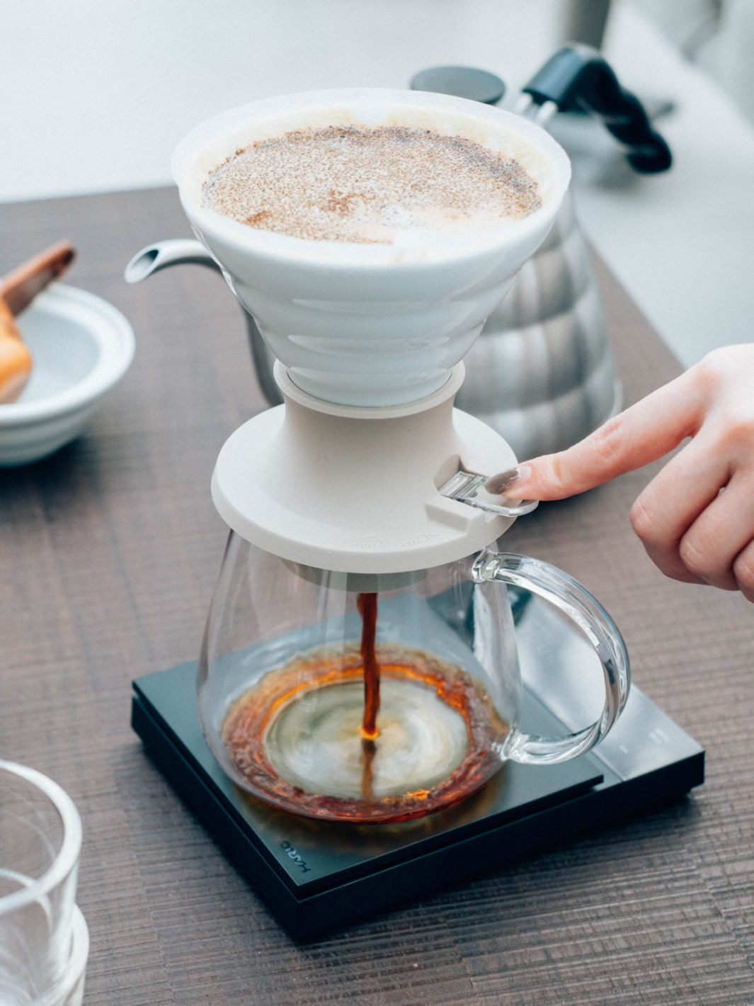 Simply place a V60-02 size paper filter and ground coffee into the ceramic dripper, then gently fill with fresh hot water. Then, when your desired steep time has been reached, just press the switch on the base, which releases the freshly brewed coffee into your cup. Perfect extraction, simplified.